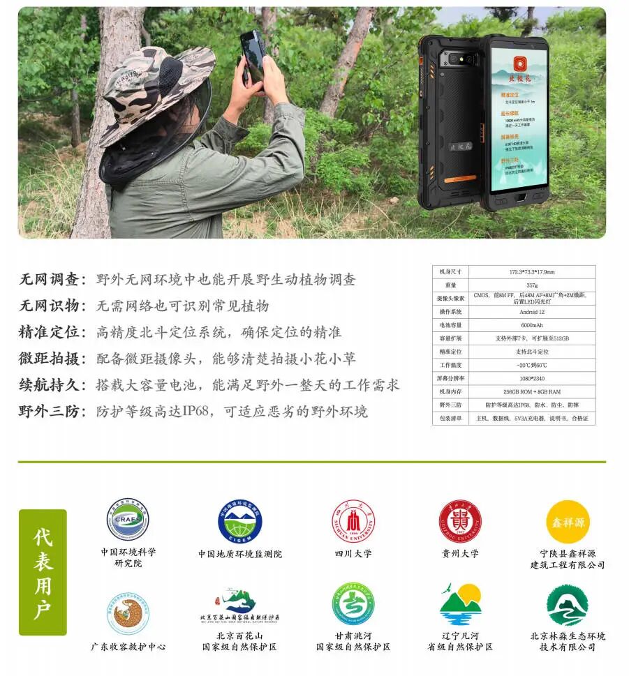 基于北极花生物调查APP量身定制的硬件设备,适用于无网络环境,具有离线AI识别植物、精准定位、续航持久、野外三防等优点。