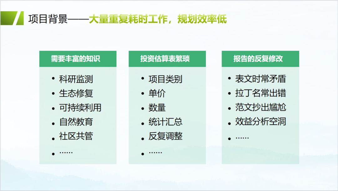 国家要求,2025年需完成自然保护地整合优化,规划的任务将十分繁重。为了应对这一挑战,云南省林业调查规划院组织开发了自然保护地规划智能编制系统。系统研发以规范规划编制流程,提高规划编制效率,节省规划编制时间为主要目标,有效解决了规划编制工作中的痛点和难点。