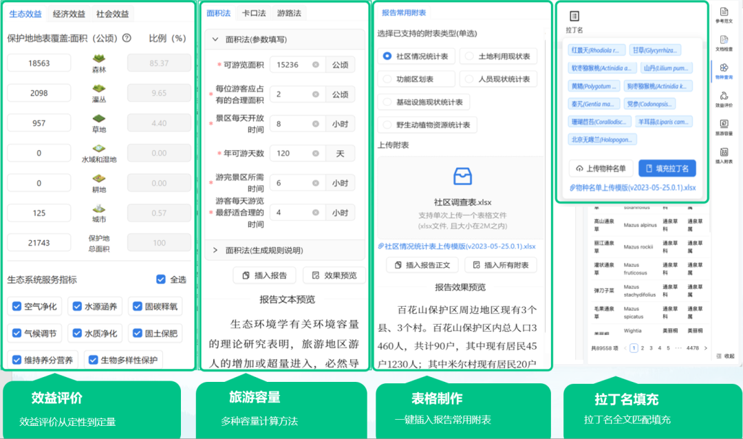 4、实用工具集合:系统还提供了效益评价、旅游容量计算、表格制作和拉丁名填充等实用工具,进一步提高了编制效率和报告质量。