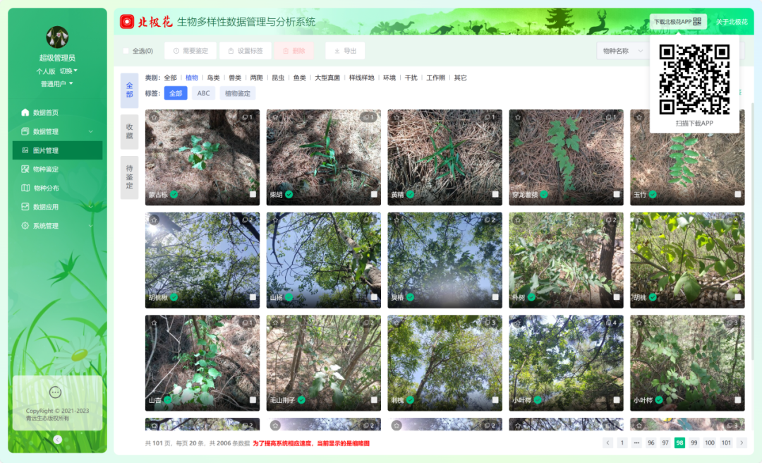 北极花网页端可以自动同步北极花APP采集的数据,系统按照北极花APP的调查数据对植物图片进行归类和整理,为《百花山重点保护植物图谱》编写提供数据支持。