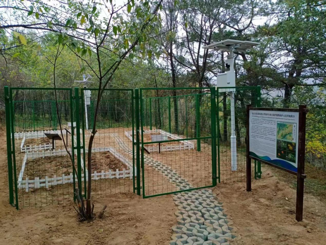 样地面积50㎡,位于西湖林林场,示范植物选取了北京市重点保护野生植物刺五加(Eleutherococcus senticosus)、金莲花(Trollius chinensis)、款冬(Tussilago farfara)及药用植物黄芩(Scutellaria baicalensis)、党参(Codonopsis pilosula)。同时,在样地内布设监测设备和气象站。科研人员可以在样地中进行相关的植物保护研究,探索植物的生物学、生态学特性和保护技术。