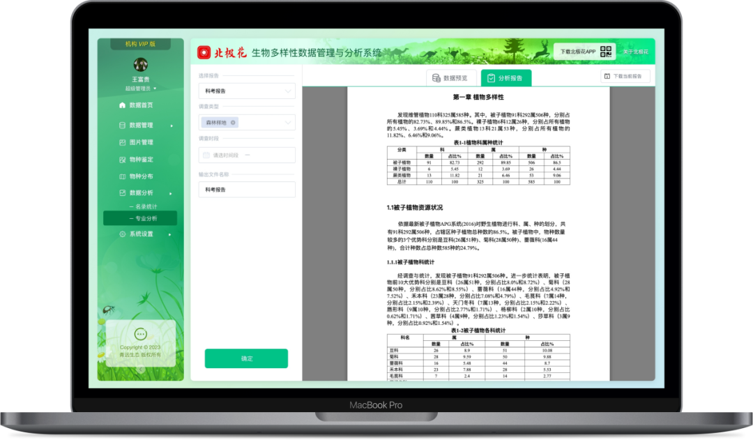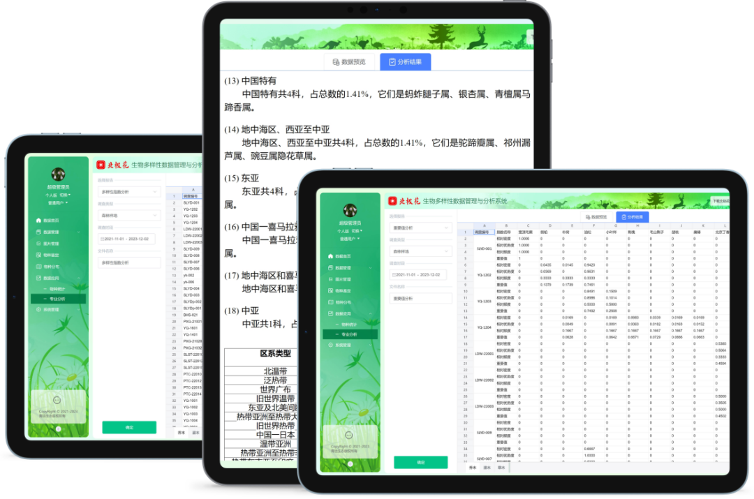 针对已经导入系统的动植物调查数据,可以开展各类数据分析,包括物种名录生成、物种统计、重要值计算、生物多样性指数计算、区系分析等功能。
