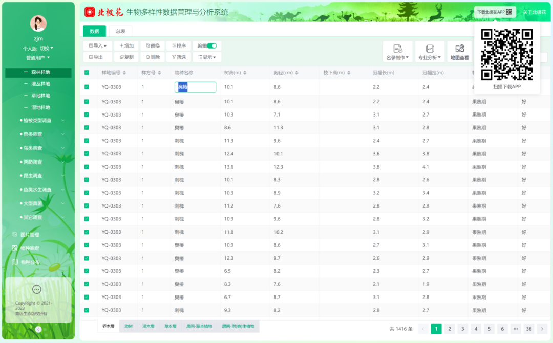 数据管理是数据分析使用的前提,是确保数据正确的关键,也是最耗时的一个环节。北极花网页端可以自动同步北极花APP采集的数据也支持用户上传数据,系统按照北极花APP的调查数据进行归类,分为植被、植物、鸟类、兽类、两爬、鱼类、环境和干扰等类型,并配备了筛选、排序、查找以及数据的增删改查等功能,方便用户快速定位和查看数据。