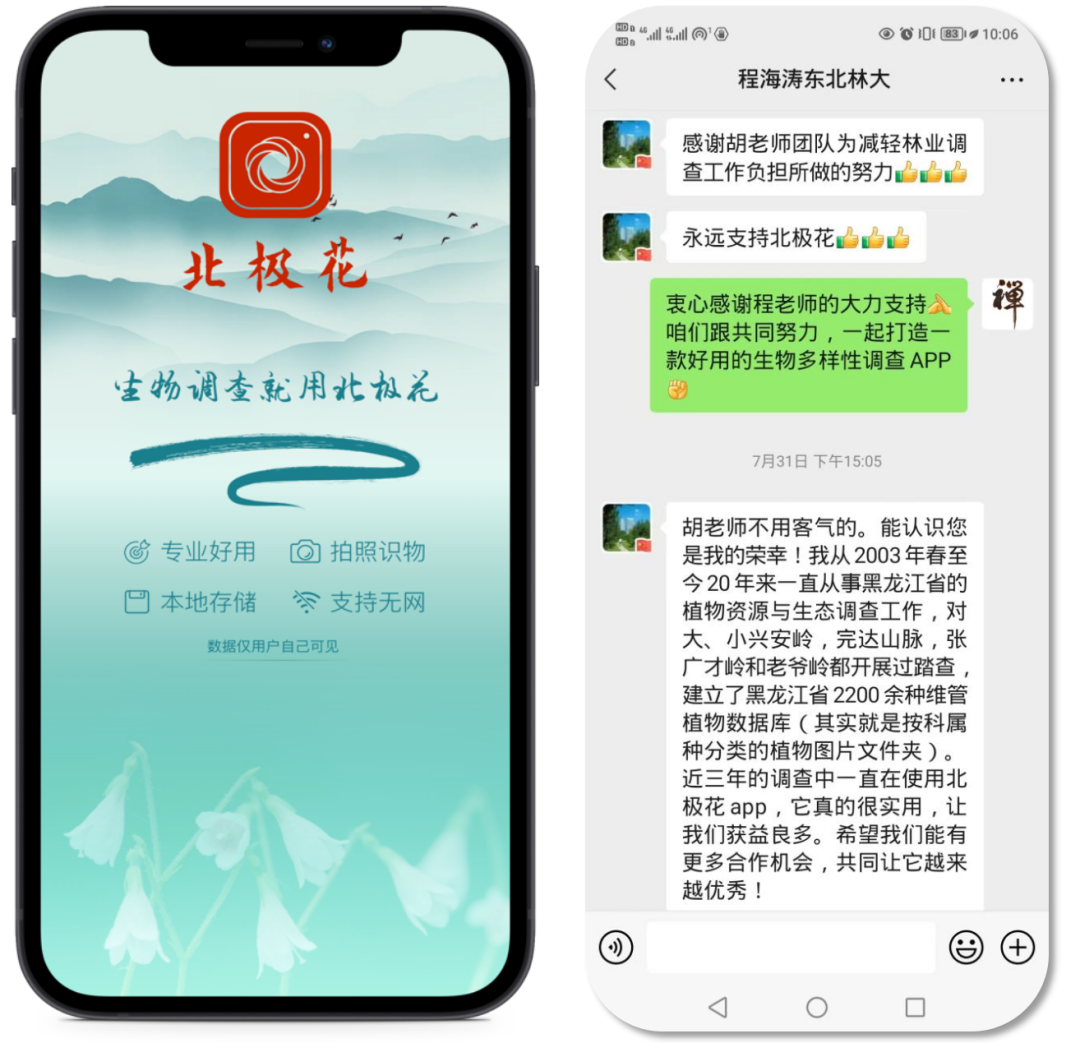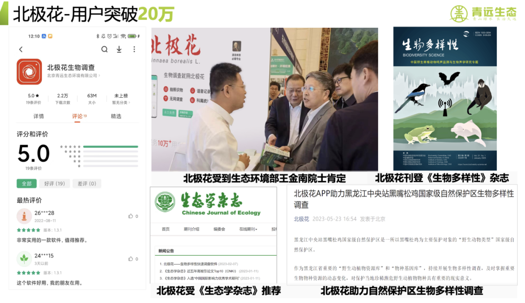 北极花APP的开发得到了张志翔教授、李俊清教授等、张希武司长等专家和领导的指导与关怀,也得到了广大用户的支持和反馈,并受到了《生物多样性》《生态学杂志》等多家生态学主流期刊推荐,荣获北京市第十八批新产品认定。北极花APP的定位:1)降低生物多样性调查门槛;2)缩短调查和数据处理时间;3)节省生物多样性业务费用。