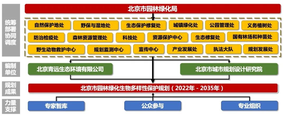《规划》编制由北京市园林绿化局牵头,自然保护地处、规划监测中心等各部门协同推进,北京青远生态环境有限公司和北京市城市规划设计研究院共同承担编制,坚持高标准要求、高水平攻关,力求服务北京园林绿化生物多样性高质量保护。