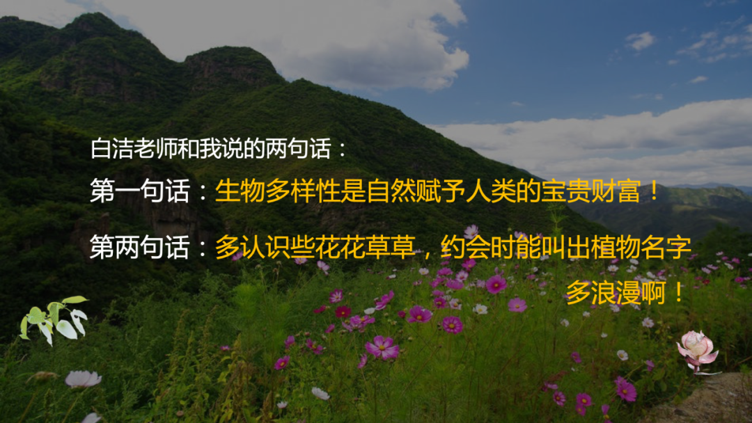 后来我的植物分类学白洁老师给我说了两句话,就真正的改变了我的人生轨迹。她说的第一句话是:生物多样性是自然赋予人类的宝贵财富。我记下来了,当然她也跟我说了第二句话,这句话我后面再跟大家分享。