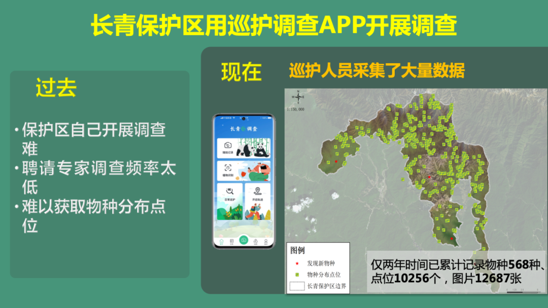 这个软件最早是在长青保护区得到了很好的应用。过去他们保护区调查也主要是请这些专家来参加,专家一般都是在暑期才有这个时间,其他时间他要上课,他也来不了。专家调查的频次就太少了,找的点位也太少,所以说他们也很难获得很详细的数据。现在保护区有了这款巡护调查APP,他们就可以让自己的人大量的去巡护。这张图记录了他们两年期间走的点位,已经达到了一万多个点位,记录的物种也达到了五百多种,这是保护区自己完成的工作,没有靠专家。