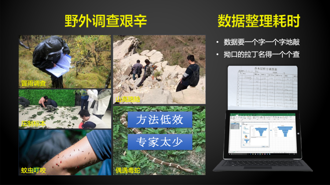 为什么说这项工作很艰难,要花很多时间的,当时我们野外调查效率就不高,我们要着纸笔一条条的记录,碰到了这些物种不认得的,我们还在拍照,采标本回来还得鉴定等等。这样整个夏天,整个生长季我们都在野外搞调查,好不容易完成了调查,回到室内我们又得一个一个的把数据敲到电脑中来,拉丁名一个一个的查找,特别的耗时,这又耗掉了好几个月,所以说这项工作特别的低效。