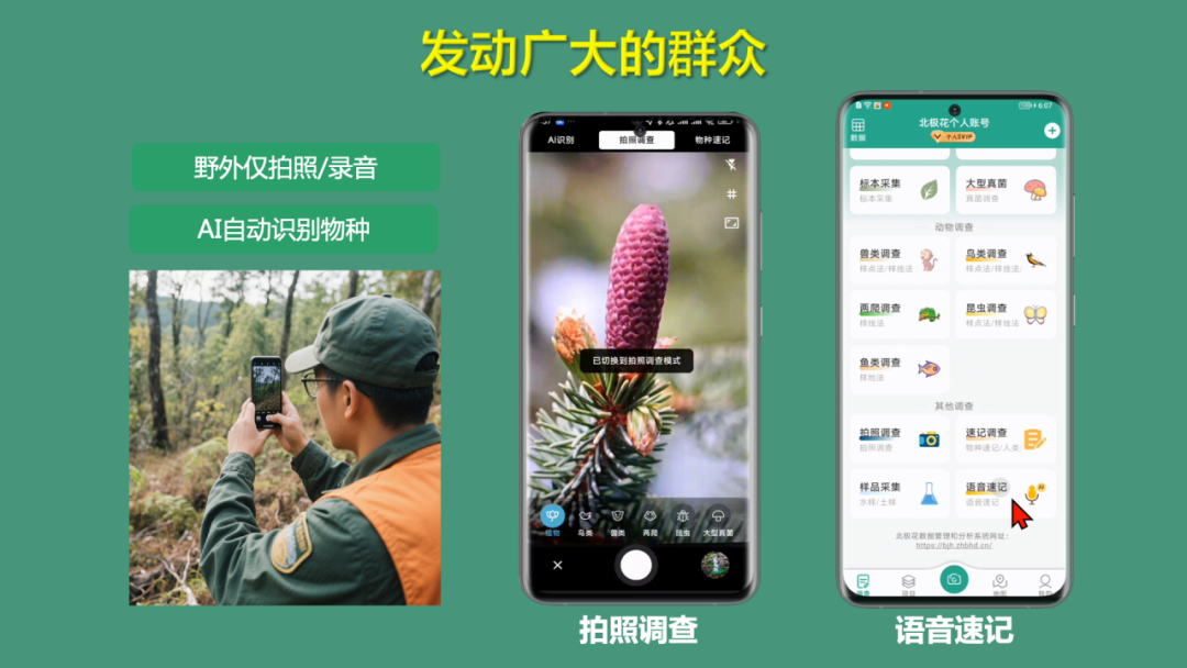 要把公众的腿加专家的脑模式给它真正的发扬光大,真正的用好,必须要有广大的公众的参与,没有大家的参与,那么这也只是一句口号。但是公众不可能像专业人员那样去使用这个软件,所以我们在北极花里面又有几个特别简单的模块,比如拍照调查,语音速记,也就是说你拍一个照,或者说一句话就能帮着去调查,这是一种特别简单高效的方法。
