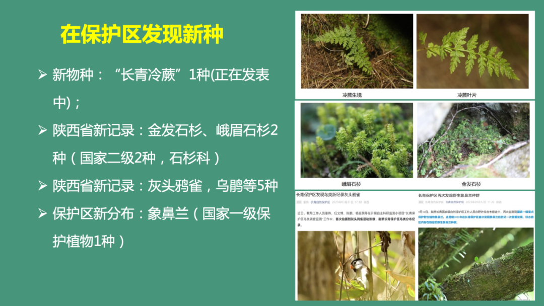 让我感到更高兴的事情是,他们自己还发现了新种,比如长青冷蕨物种,这是保护区自己发现新种在保护区来说,靠自己力量发现这是很难的。还发现了几个陕西新分布的记录,比如金发石杉,还有峨眉石杉等等。还有一种是国家一级保护植物象鼻兰,也在保护区内发现了,如果没有高强度的调查,我相信这些物种是很难被我们找到的。