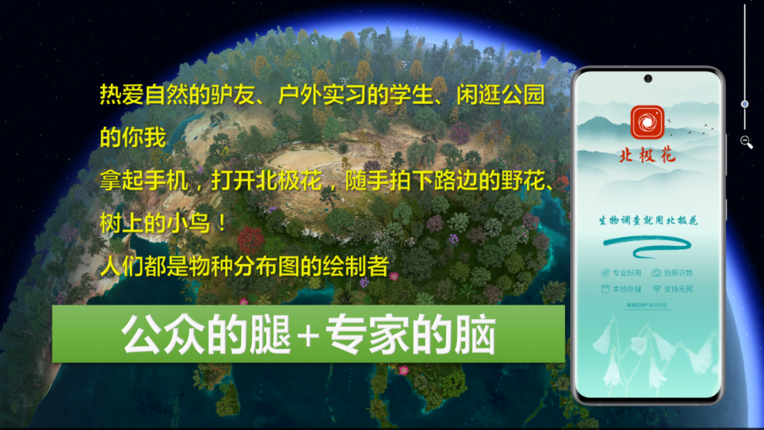 所以我呼吁咱们热爱自然的驴友,还有同学们,以及闲逛公园的你我,咱们共同行动起来,掏出手机,打开北极花软件,去拍下你身边的花花草草,还有树上的小鸟,记录你生活城市中的这些物种。我相信当大家共同参与进来的时候,咱们国家的生物多样性宝藏图就一定能实现。然后全球的宝藏图也一定能拼上中国这一块特别重要,特别有独特性价值的这一个板块。