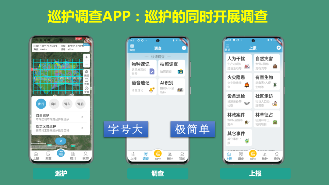 因此为了把巡护员调动起来,我们又开发了巡护调查APP。因为巡护员跟公众比,他们的年龄更大,他们的学历可能会还偏低,如何让他们还能使用它,我们就要更简单,更符合他们的使用,就像老年机一样搞的字特别大,特别简单,他们才能用。