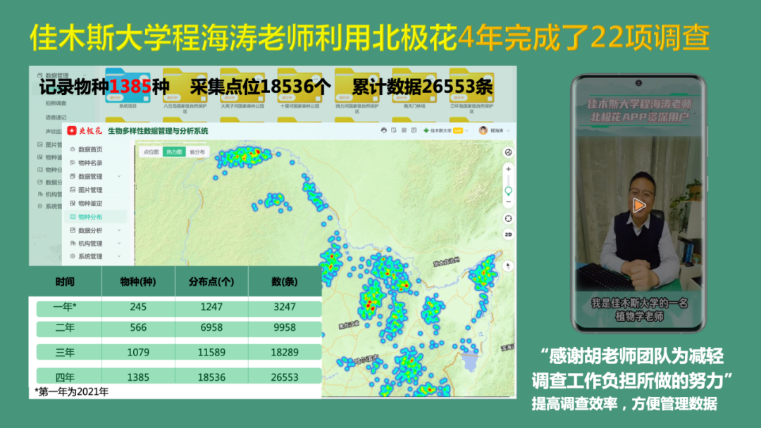 其中我特别想讲一下佳木斯大学程海涛老师的故事,他是2021年的时候就在用这款软件,他用这个软件到现在四年的时间,他已经完成了二十多项大型的生物多样性调查任务。 程老师说如果没有北极花的帮助,他在四年之内是不可能完成这么多项目,他也不可能这么有序的把数据管理好等等。其实我也特别的感谢程老师,虽然我们两个人只见过两面,程老师对我的支持特别大,经常给我反馈,也一直忍受北极花的各种各样的问题,给我提建议,所以这个软件到今天能有这么多用户,程老师是我的贵人。