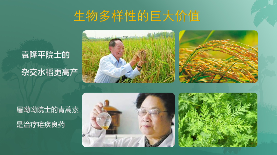 为什么说它是宝藏?我讲两个第一个是袁隆平院士,他发现了杂交水稻,让地球可以养活更多的人。第二个是屠呦呦院士,她提取青蒿素,救活很多疟疾病患者,这都是很了不起的事情,都来自于植物。