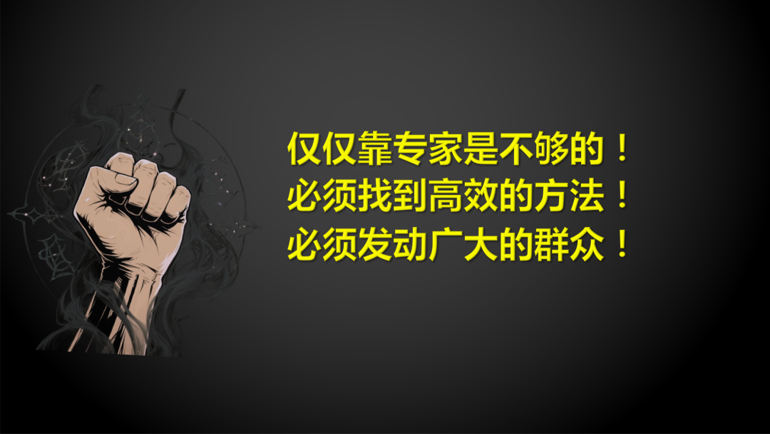 当然我们也想过找更多的专家来参与,但是我们也没有那么多经费发动那么多专家,所以当时我就清醒认识到,仅依靠专家,这是一项无法完成的任务,我们必须找到高效的方法,我们必须让群众也能参与进来,所以后来我就在思考如何去寻找高效的方法。
