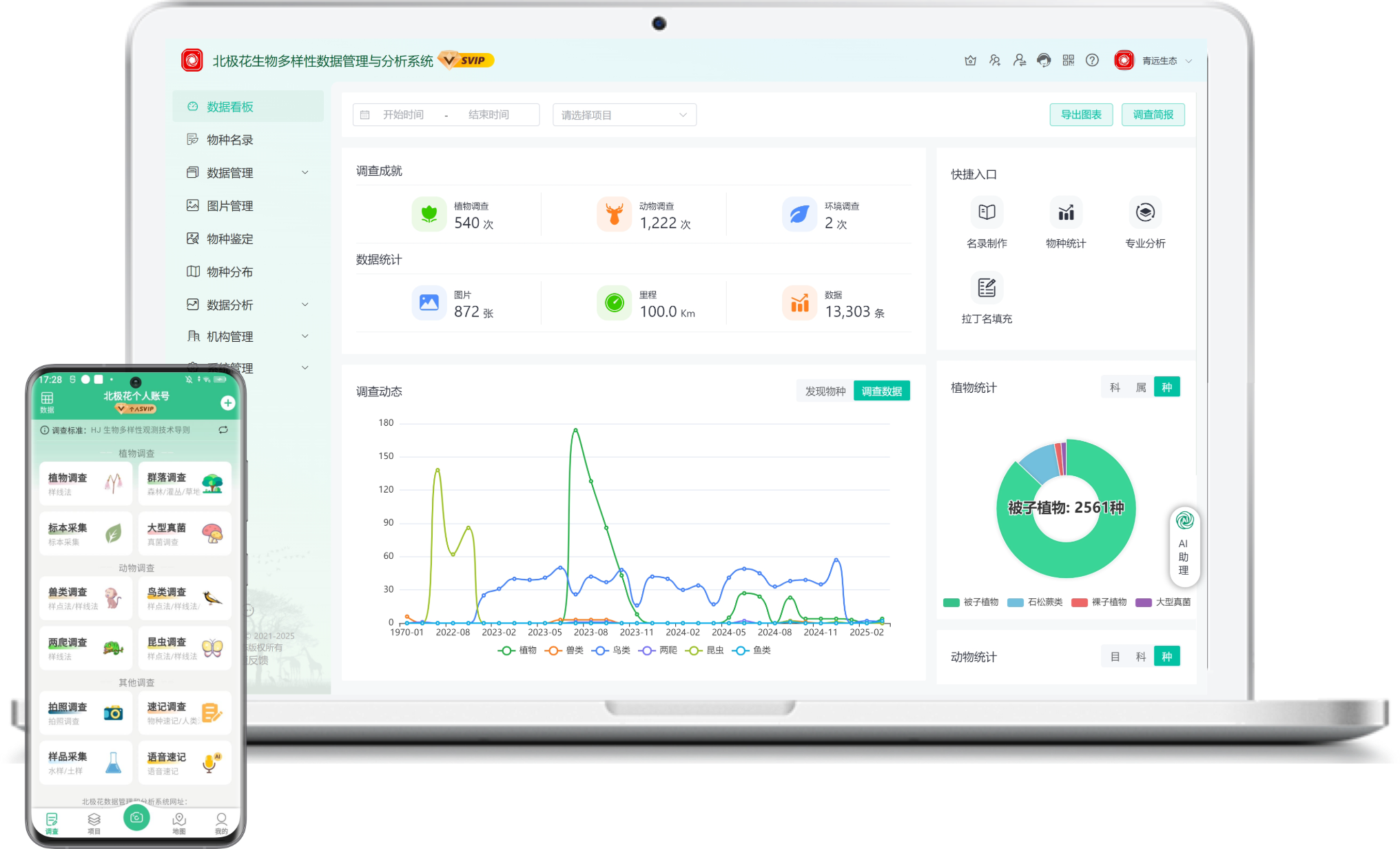 (1)AI物种识别+专家在线鉴定:通过图像识别技术快速匹配物种信息,疑难物种可一键提交至专家库,由权威学者远程协助鉴定,解决基层调查中识别难的痛点。