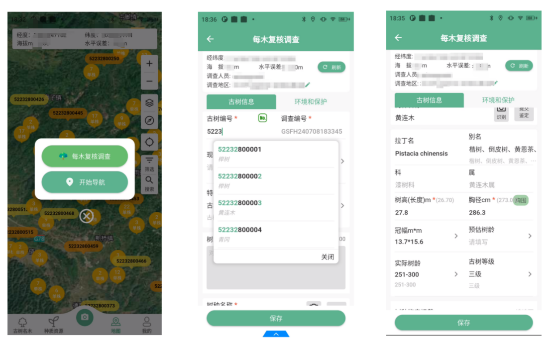 系统还支持自动获取地理位置、古树编号自动匹配、树种名称模糊检索等功能,显著提高了野外数据采集效率。
