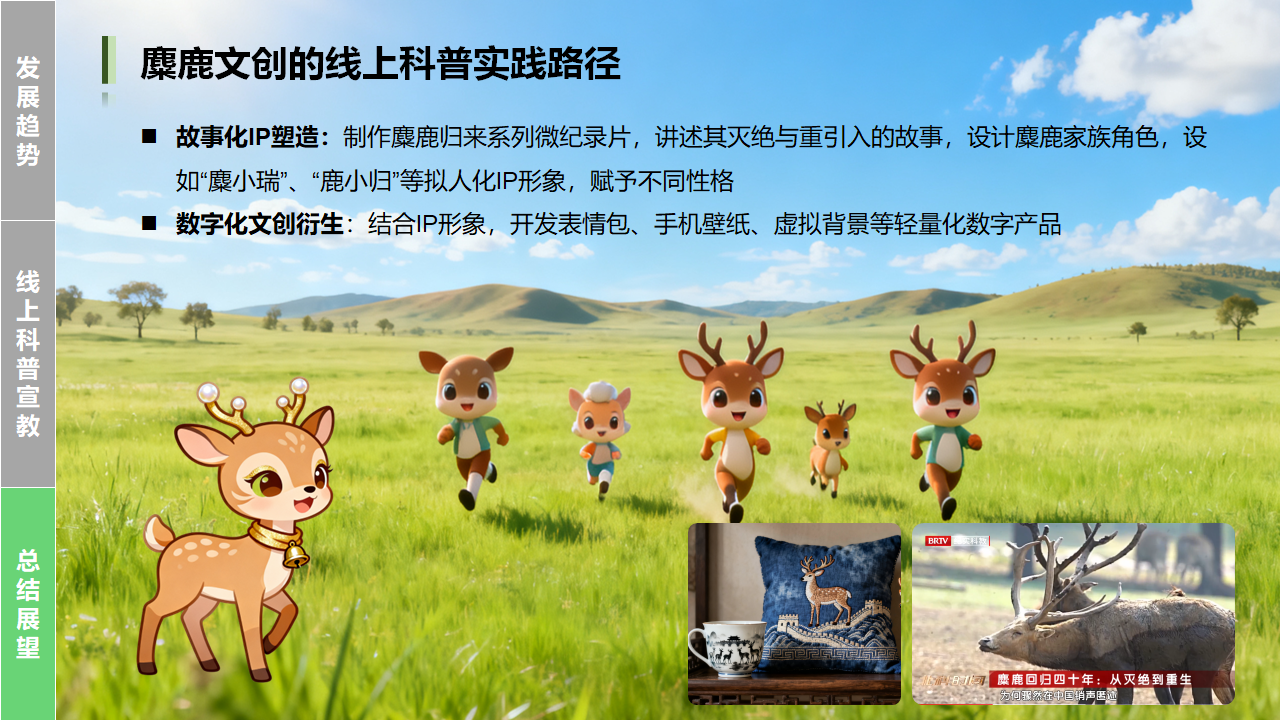 在本次会议上,我们也分享了源于麋鹿保护启发的未来设想:通过故事化IP塑造、虚拟数字家园构建和游戏化学习机制,打造更深度的线上宣教模式。