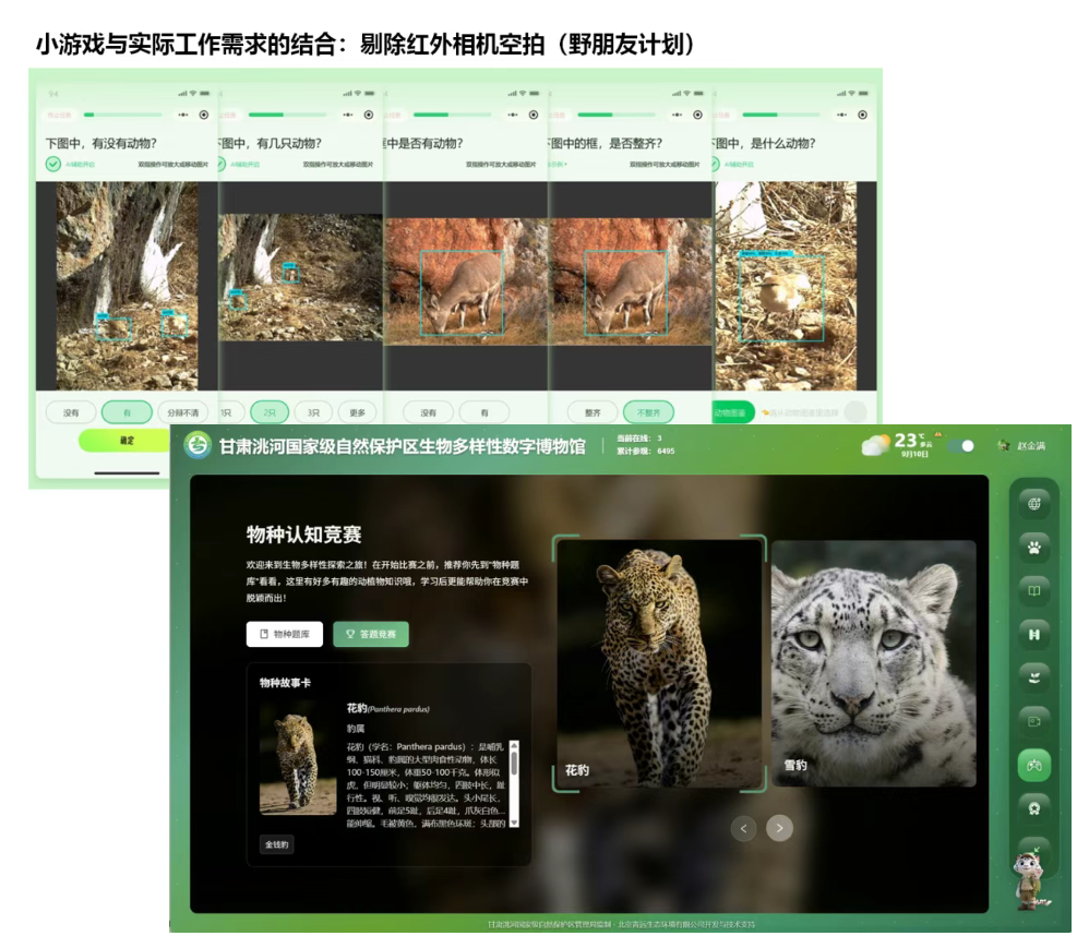 红外相机辨图游戏:将真实的野外监测工作设计成小游戏,邀请公众帮忙识别相机拍摄到的动物,体验“云端科研员”的乐趣。