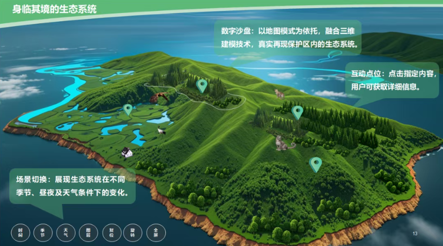 以真实地理数据为依托,通过3D建模技术,立体还原了保护区的山川、森林与湿地。